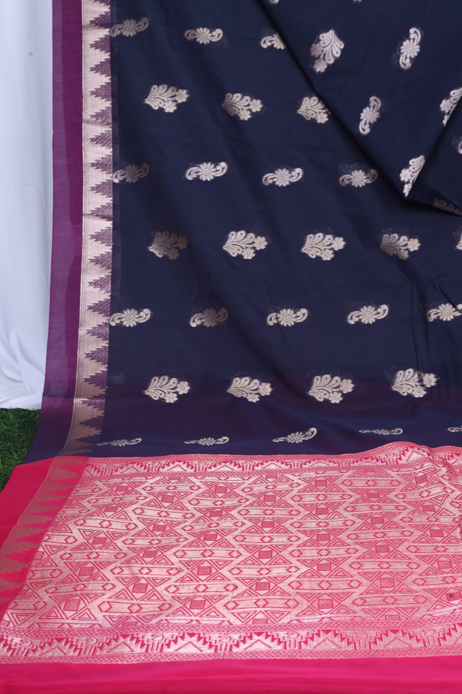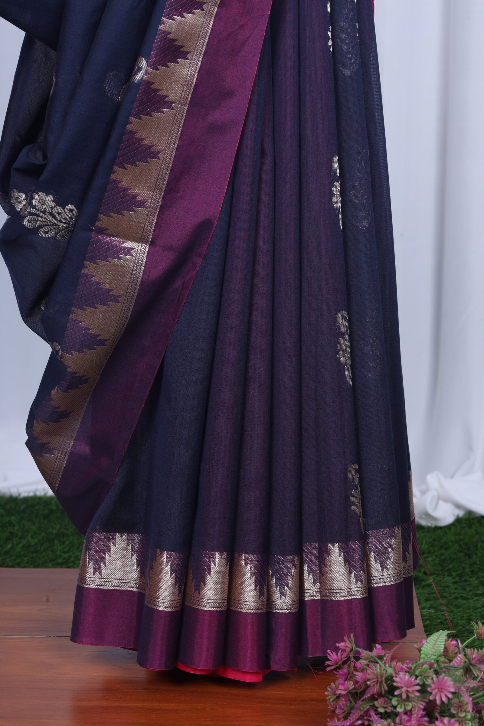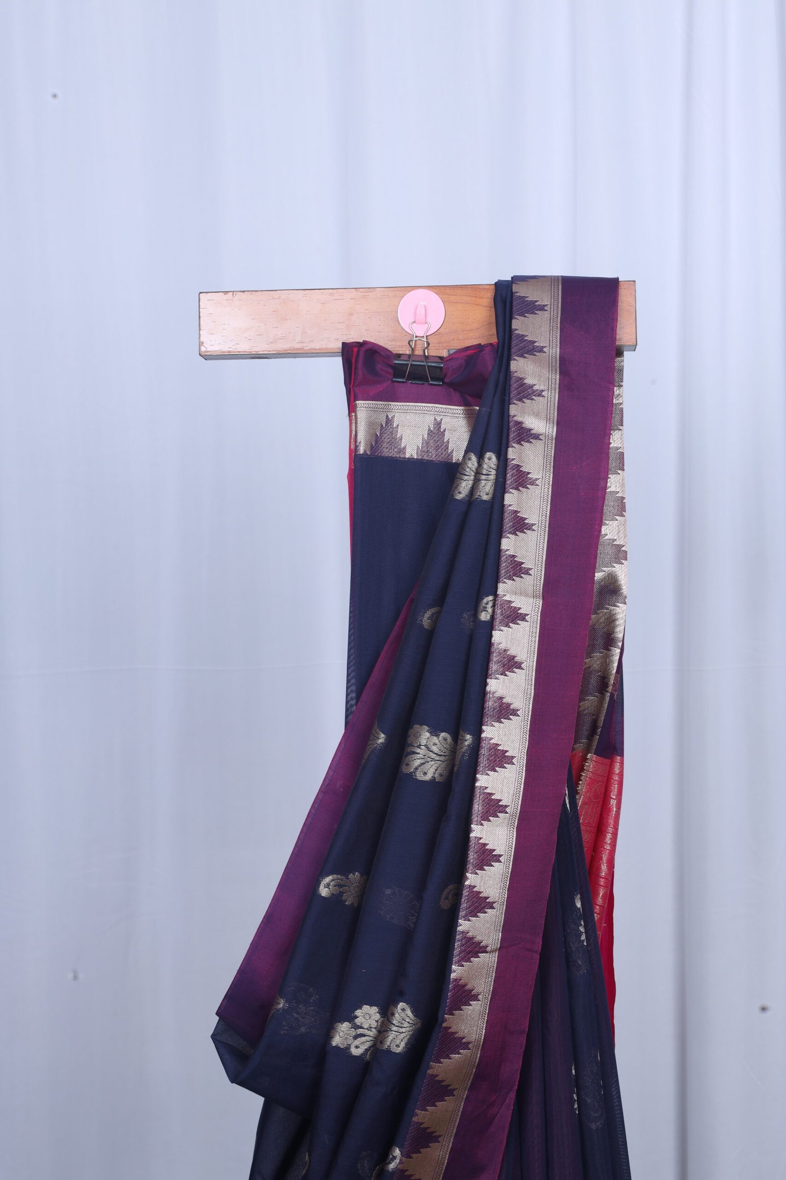 Drape yourself in timeless elegance with this exquisite navy blue Kanchipuram silk saree. The saree features rich zari motifs woven across the body, paired with a striking maroon border adorned with intricate golden designs. The shimmering zari pallu adds a touch of grandeur, making it perfect for weddings, festive occasions, and traditional celebrations. Crafted from premium silk, this saree ensures a luxurious look and feel, blending classic artistry with sophistication.